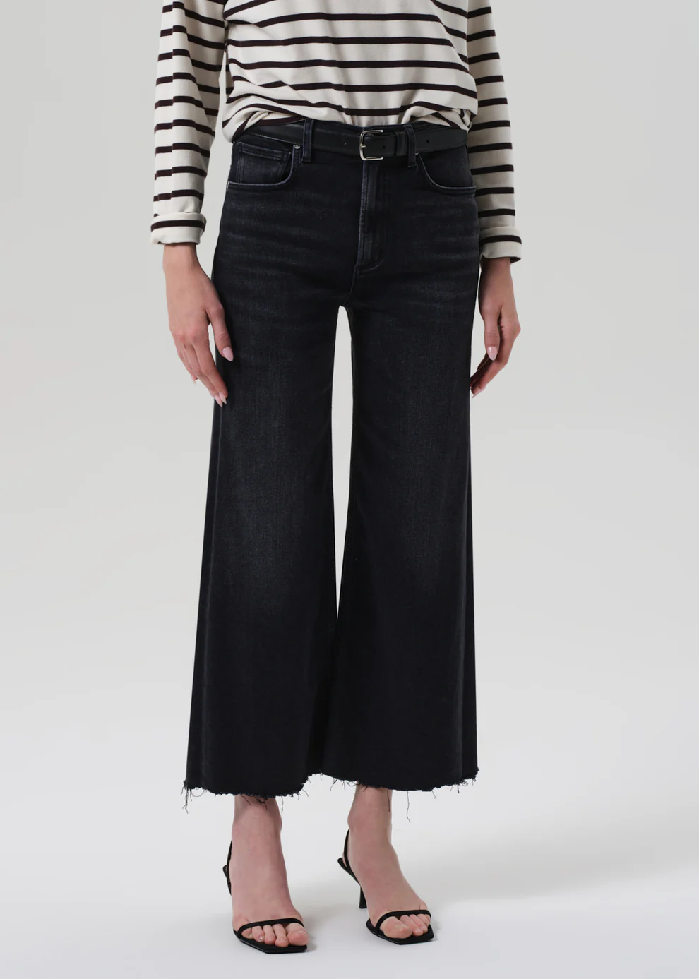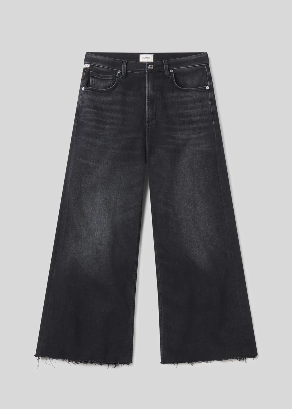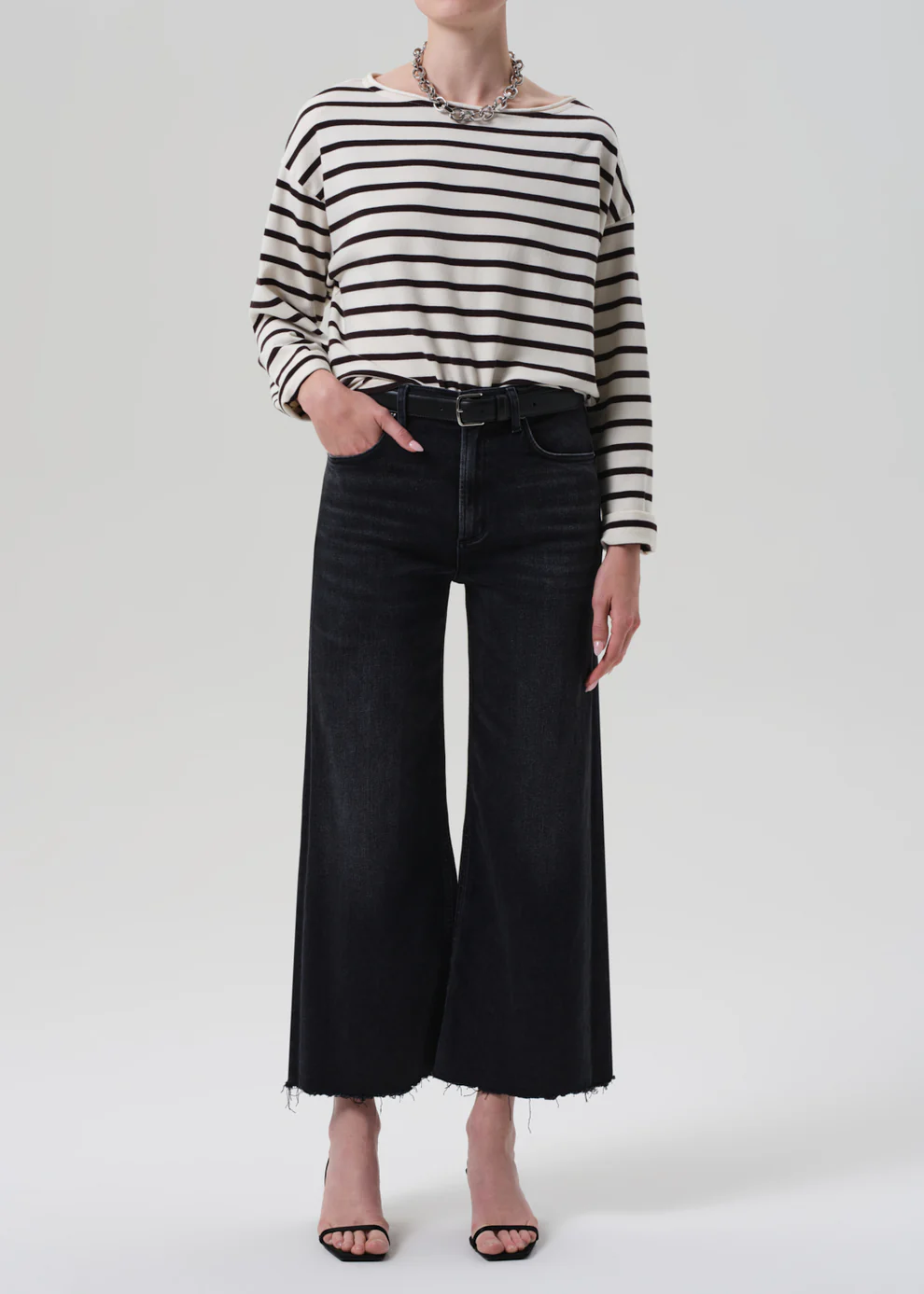 Jeans Wide Leg Crop con fondo taglio a vivo, realizzato in morbido denim elasticizzato con lavaggio nero slavato.
