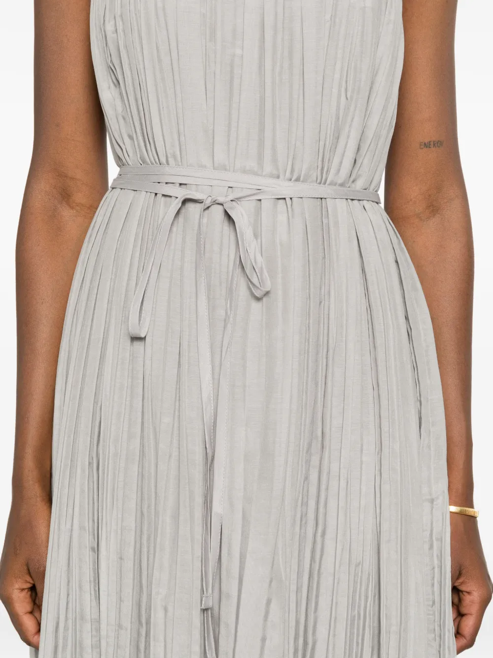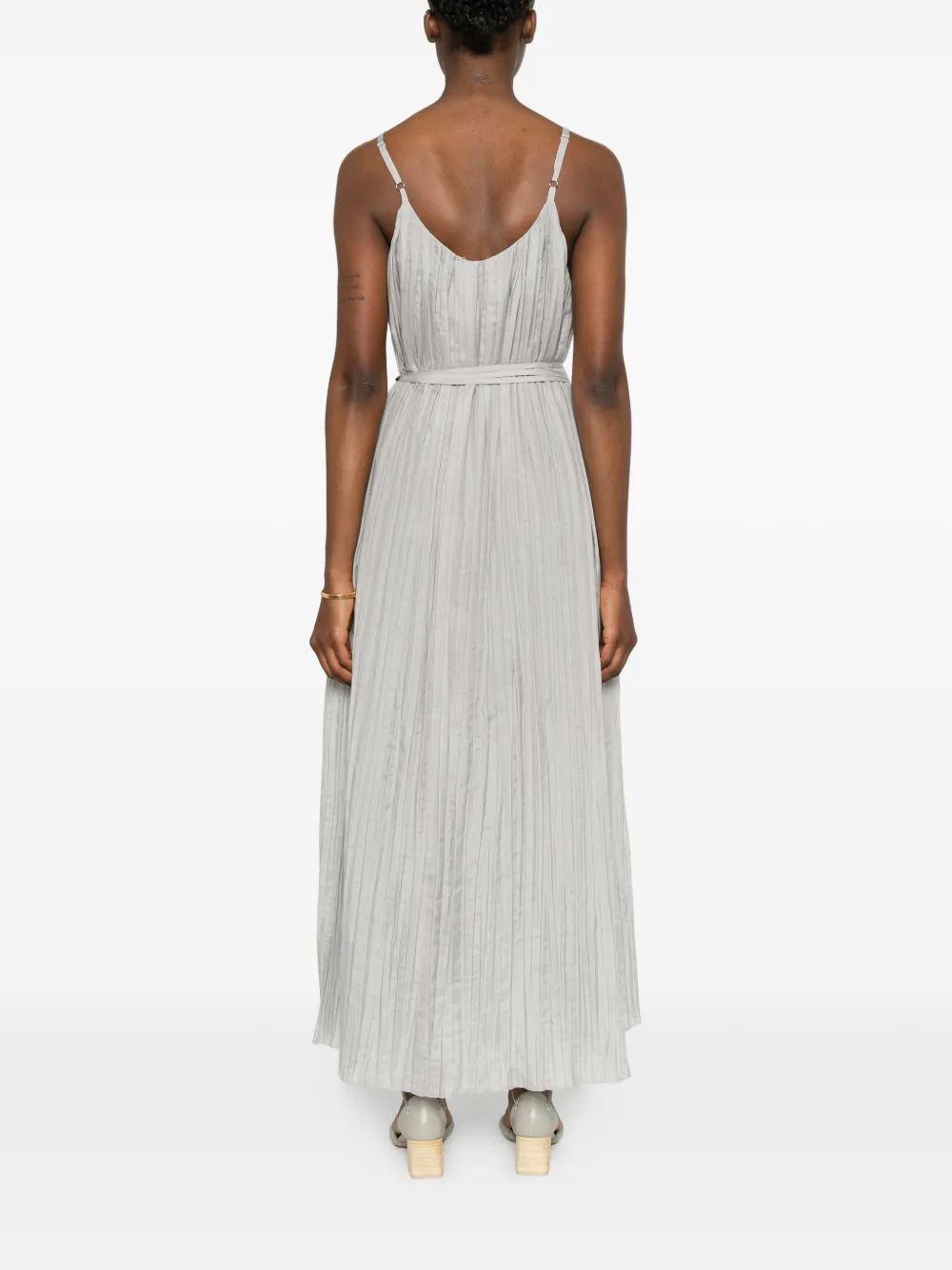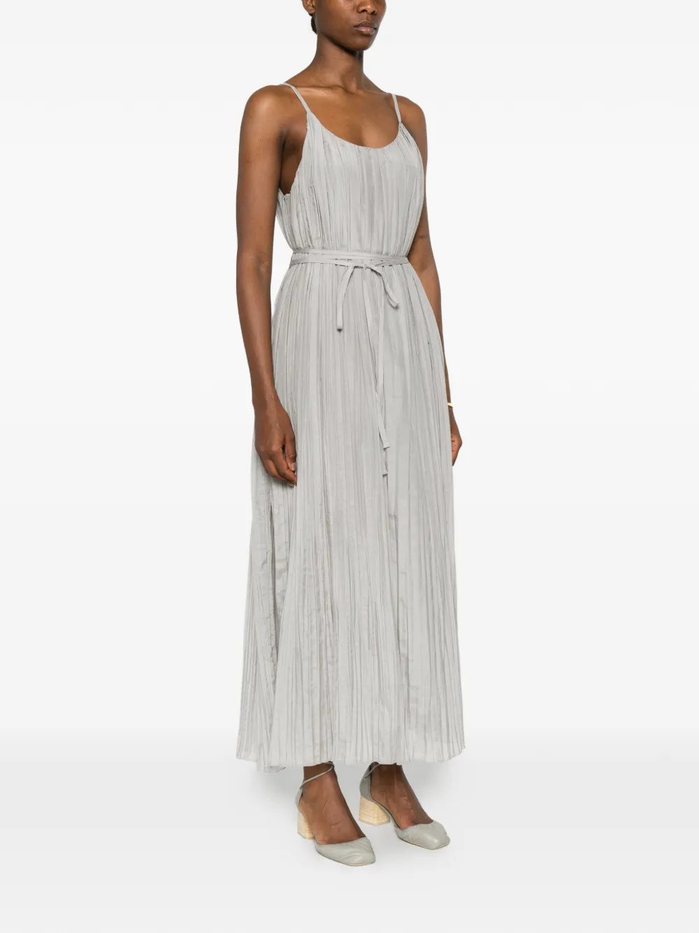 Abito lungo alla caviglia con spalline sottili e scollo ampio, realizzato in tessuto di cotone e seta effetto plissè stropicciato.