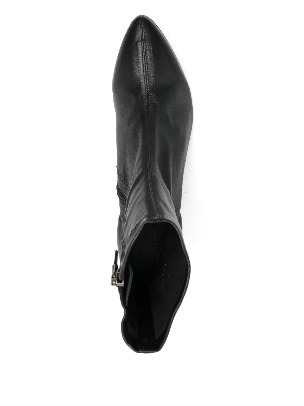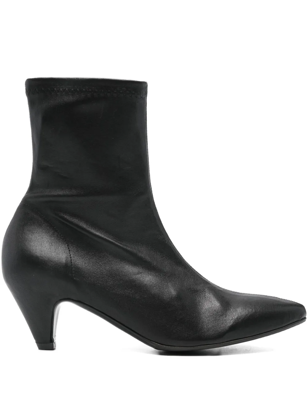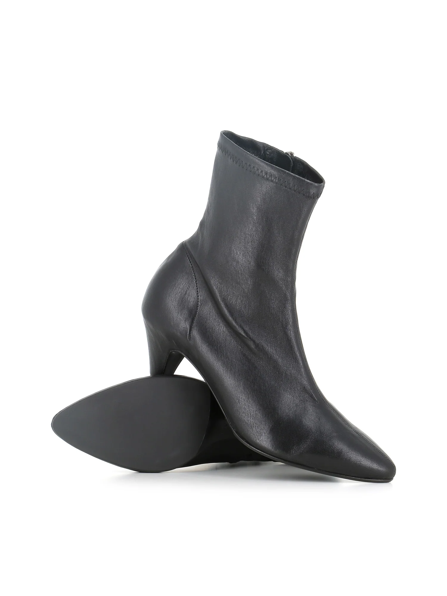 Stivaletto in pelle con gambale stretch e design a punta, suola in cuoio con mezza gomma. Interno sfoderato e chiusura laterale con zip, tacco a cono 5,5 cm fasciato tutto d’un pezzo con la tomaia.