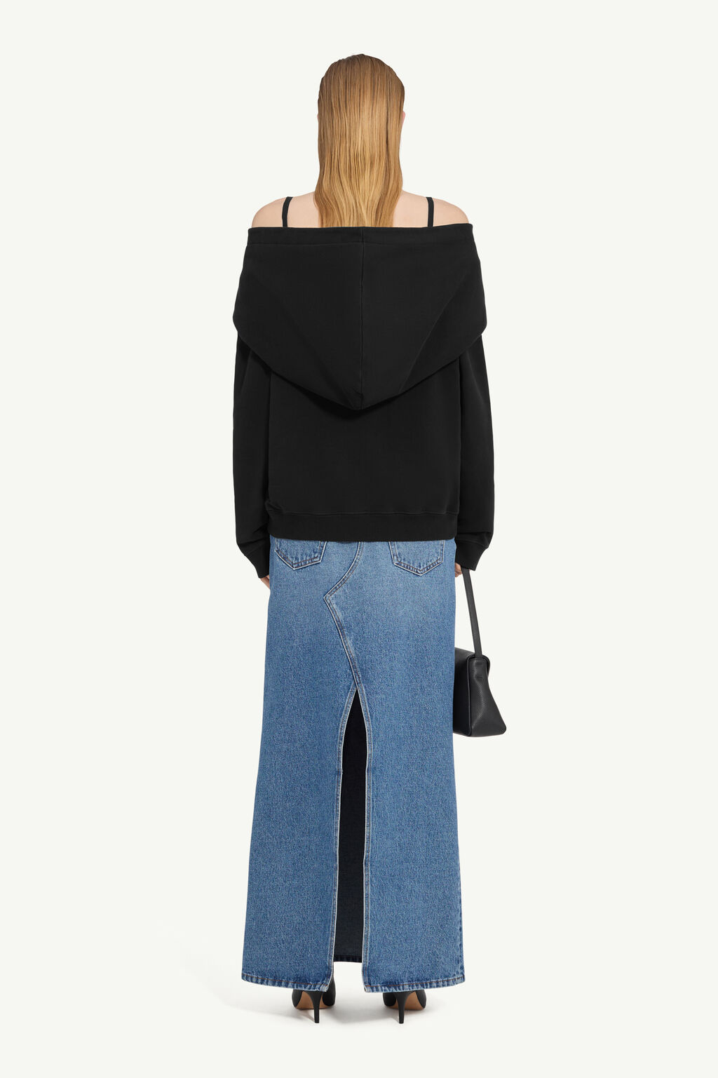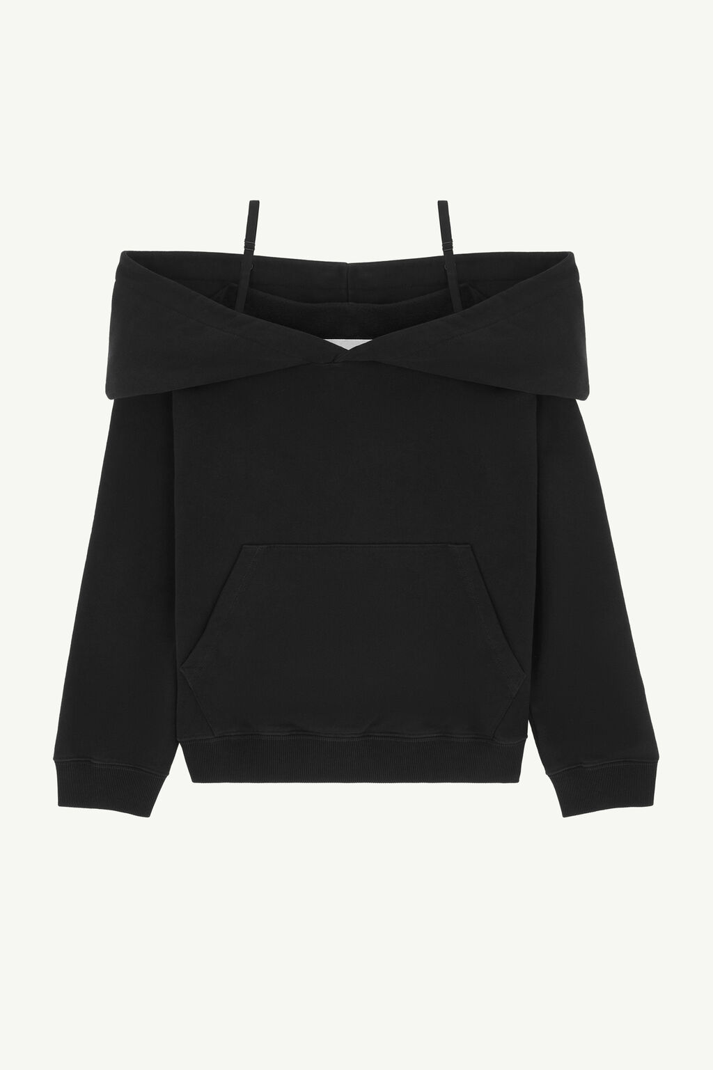 Felpa in cotone con polsini a coste e tasca frontale a marsupio. Rivisitazione della classica felpa, il cappuccio oversize si trasforma in una scollatura drappeggiata, offrendo molteplici possibilità di personalizzazione.